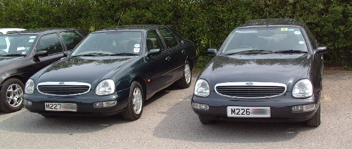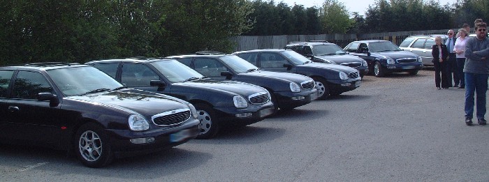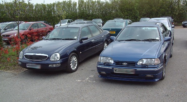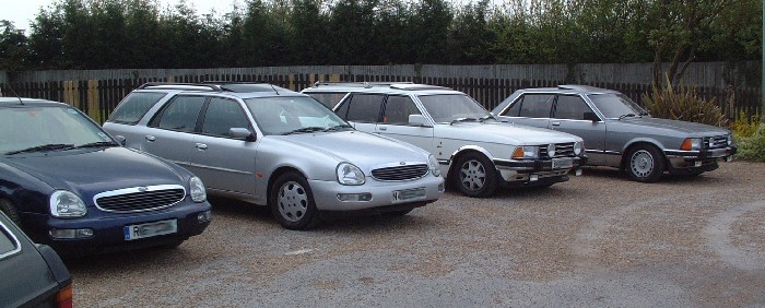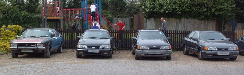 Two blue Cosworths. On the right a 95 Granada Scorpio with the BOA Cosworth engine, next to a 97 Scorpio Cosworth - BOB engine. Of the two, the Granada look the larger, but both vehicles have an identical floorpan so the difference is illusory. Further along the line from ours, two nice MkII Granadas, an estate and a saloon had appeared.