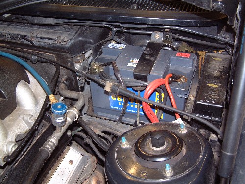 Below, a UV light test of the pipe as it nears the bulkhead. The larger diameter pipe above is the Low-Pressure pipe (gas line) - the gas has been evacuated from the system through this point. Below the metal pipe is the smaller diameter High Pressure pipe, which is mainly rubber and has metal connections crimped at both ends. Here the crimp is leaking. Although it does not show clearly on this photo, the UV lamp shows bright traces around this joint - the crimp has failed and the system has lost a lot of gas. Mark, from Aircon Direct came out to me to fit the new one I had bought (from Ford Parts UK, excellent service, thanks guys.) The pipe runs from the regulator block where it is clamped with a single screw and an H clamp with the Low Pressure pipe above it. In order to release the torx screw securing the H clamp the battery shelf needs to be removed. The rubber bonnet seal is pulled off the top of the bulkhead and the two 'fir-tree' fasteners are pulled off on each side. The battery partition is then removed from the bulkhead, leaving much more room to get to the regulator block. Above, the battery shelf is exposed. To the left of the battery the regulator block can just be seen.