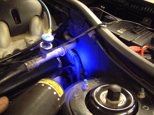The High Pressure pipe, (sometimes known as the Liquid Line), runs from the receiver/dryer mounted by the front nearside headlight, underneath the air-filter housing and - on the 24V at least - along the nearside wing behind the nearside MacPherson strut turret and reaches the AC evaporator housing through the engine bulkhead. At the 2004 Orpington Meet John Orford from Aircon Direct noticed that the pipe on my Scorpio Ultima was suspect.