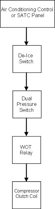 Refrigerant Pressure Switch Next in circuit is the Wide Open Throttle Relay (WOT), this relay is located in the Auxiliary Fuse box Relay R24 and is energised via the PCM when it detects full throttle. When full throttle is detected the WOT is activated switching off the compressor and allowing maximum engine power to the drive chain. Click here for location of the WOT relay. Finally and last in line is the Compressor Clutch coil, this engages the compressor to the drive belt when energised. A “flywheel” or back emf diode is wired across the coil to shunt the high voltage generated when the magnetic field collapses. Fault Finding If the compressor is not engaging and an electrical problem is suspected, the following may help. If you suspect it’s a mechanical problem with the clutch you may wish to try step 6 first to try and prove this. Before proceeding, please ensure you understand how the cycling system works, noting that the compressor does NOT run continually. 1. Fuse Locations Fuses F33 & F34 for Air Conditioning circuits (including SATC equipped models). 2. Check the supply from the Heater or SATC panel to the De-Ice Switch Locate the De-Ice Switch in the engine bay. Click here for exploded view showing De-Ice Switch.