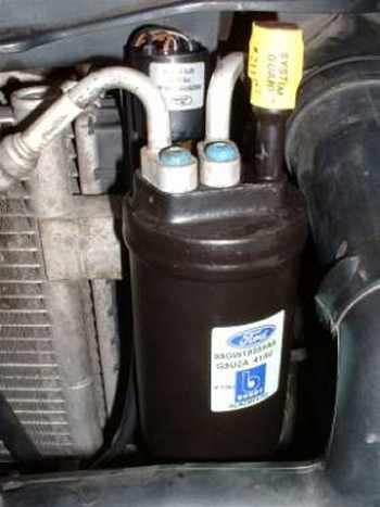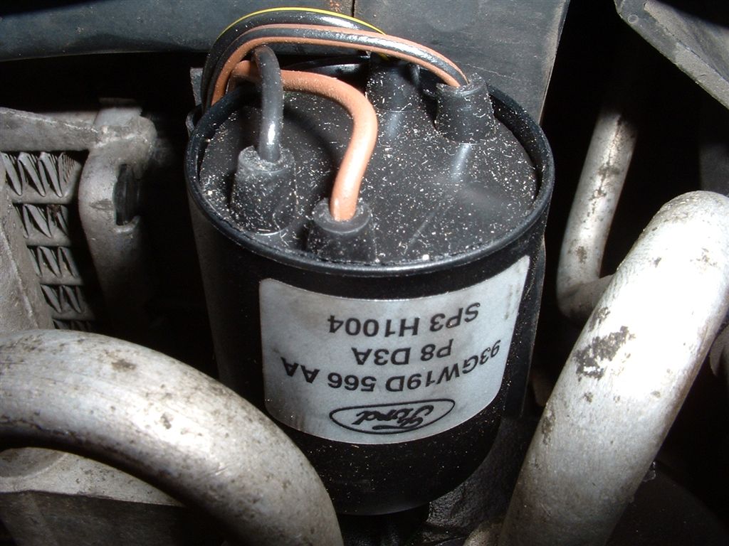 Click here to see a description of the De-Ice switch operation. The De-Ice switch cycles between on and off states to maintain an average Evaporator Core temperature, as it turns on and off the compressor. When closed current flows through the De-Ice switch to the Refrigerant Dual Pressure switch, sometimes incorrectly referred to as the High/Low Pressure switch. This monitors the pressure of the refrigerant and has two separate contacts. One is used to signal the PCM of a pressure problem, the PCM will then command the Engine Cooling Fans to run at full speed, hence also cooling the Air Conditioning Radiator, or more correctly the Condenser. The second contact interrupts the flow of current in a pressure fault, hence turning off the compressor. Note, Scorpios with the fans running fast all of the time may have an air conditioning fault such as a refrigerant problem or a blockage.