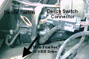 Location of De-Ice Switch The De-Ice Switch is located to the left of the Evaporator Housing (RHD), the picture above shows the De-Ice Switch and its inline connector, also the Thermistor that senses the Evaporator Core’s temperature can be seen (bottom left of the picture). The second connector and wiring plugged vertically in, is for the Re-circulation Solenoid.