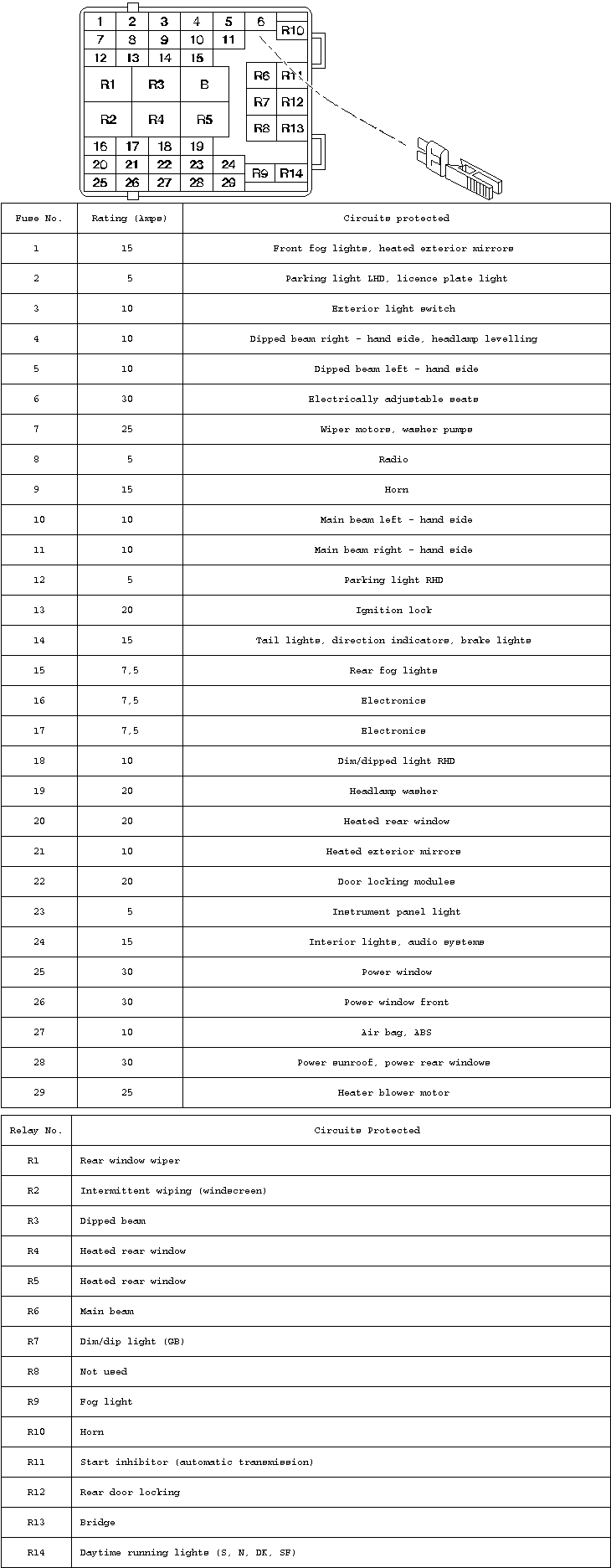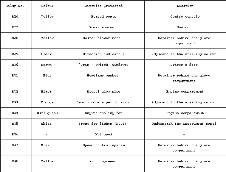Pin-Out of Pressure Switch (Loom Side). The Pressure Switch is located on top of the Receiver Dryer, this is positioned under the front plastic cover on the RH side at front of the engine bay (RHD). Its connector is inline and located by the front cross member just to the left of the Receiver Dryer, its assessable without removing the plastic cover. With the engine off, disconnect the connector, the switch side is the split portion to the right, the loom side is to the left and corresponds to the above pin out and wire colours. Start the engine and ensure air conditioning controls are to on, measuring between Pin 3 and a good chassis ground, you should have a nominal 12V if the De-Ice switch is closed, or bypassed as in Step 3. If not and you know the De-Ice switch is closed or you have by-passed it, then suspect a looming fault. If you have 12V at Pin 3, we need to know if the Pressure Switch is closed. Turn off the ignition and on the Switch side of the connector Not the Loom side! Check the continuity between Pins 1 & Pins 3, it should be low at less than 1R. 5. WOT Relay The WOT relay may be faulty, however it’s a known problem that water ingress in the Auxiliary fuse box can cause faults with the connectors in the fuse box, it may also be applicable to investigate this. Water ingress is usually attributed to no battery cover being fitted. The WOT Relay is Relay R24. Its has been reported that re-seating this relay can sometimes resolve the fault. The output of the WOT relay goes through Busbar P1 in the auxiliary fuse box. 6. Clutch Coil The air conditioning compressor Clutch coil is the final component in the circuit, when energised a “clacking” noise is briefly audible and the compressor drive wheel should rotate. Its normal also for the engine revs to momentarily drop.