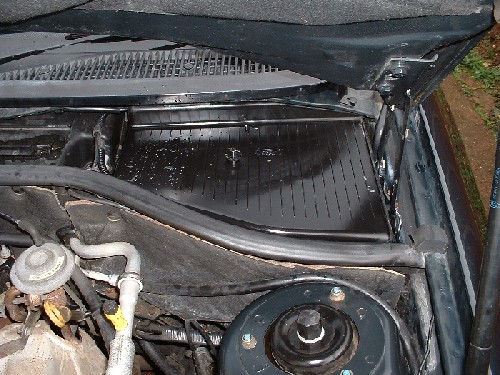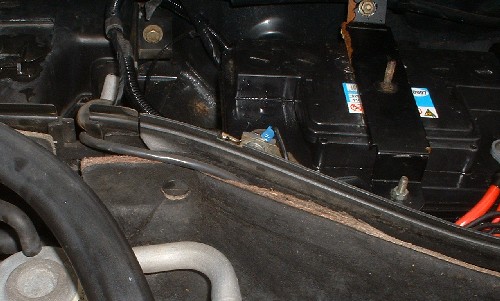 This is how your battery should look, tucked safely away beneath a cover that throws off the water from the windscreen. Recently, several owners have reported having problems with Halfords batteries - after a year or so they have failed. While they are warranted and replaced by a no-quibble guarantee, that does not recompense for the inconvenience of the car failing to start! Pete C has replaced three, and has given up. This time he has gone for a refund and bought a Original Fitment Ford Motorcraft battery. This is a Pb battery rated at 650 Cold Cranking Amps and 71 amp-hours capacity. That should sort it, then. Lower-rated batteries can be fitted, but the higher the specification of your car the more you should consider the higher rating. Eric R has used a Kwik Fit battery of a similar capacity since April 2001and has not experienced any problems. Pete C has taken these photos to show the procedure.