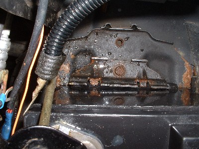 At this point some corrosion may be found on the battery shelf. It would be best to treat this before it becomes too serious. The lower side clamp can be seen here. NOTE: a properly-clamped battery is an MOT requirement.