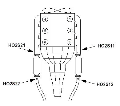 Now we must consider the configuration of the Sensors and the Catalysts. The HO2S sensors are numbered so that the upstream sensor 1 is always on the Bank which contains Cylinder # One. The down stream sensor is numbered 2. Hence the DOHC engine designs contain the HO2S sensors 11 (forward of the Catalyst) and 12 (downstream of the catalyst). On the V6 24V (the 12V is not included here because it uses the EECIV and a Y-pipe arrangement) the driver's side of the engine contains Cylinder 1, so the configuration is shown here: