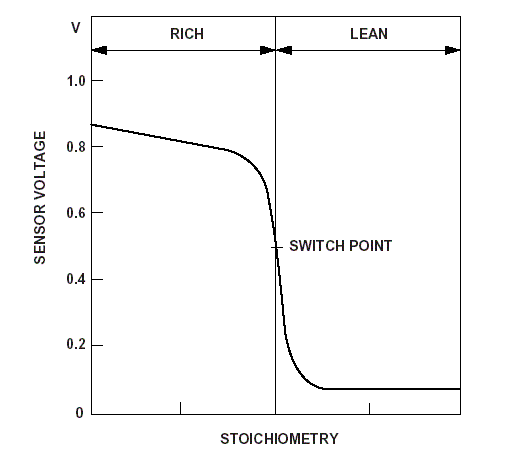 HO2S (Hot Oxygen) sensors develop a voltage between 0.1 volt and 0.9 volt depending on the amount of Hot Oxygen to which it is exposed in the exhaust stream. In Lean conditions (High in Oxygen, low fuel level) the sensor returns a low voltage, while in Rich conditions, (Low Oxygen, high fuel) it reads high. The change between the two readings occurs suddenly in what is known as a 'switch', but this term does not have any electrical connotation.. This effect is illustrated in the figure below: