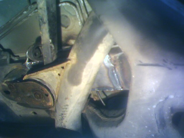 Right hand side From below Words and phone pix by Bob Lavens 14/04/2005 - thanks Bob! NOTE This above is the opinion of a welding engineer reported by Bob. I have my own engineer who checked my estate today, and found absolutely no evidence of corrosion or cracking on any part of the rear chassis. I strongly suspect that Bob's car was actually grossly overloaded at some point, either by towing or load, resulting in a flexing of the chassis. The subsequent damage would have been aggravated by the action of the self-levelling suspension. An overload on the luggage deck would have acted against the fulcrum caused by the lifting action of the levelling suspension - the resultant strain on the main chassis rails would have been colossal. If this had been a design fault or inadequate metal, as is alleged, then this would have been a common sight by now, and very well known in the trade. My own MOT man has never seen this on any Ford estate, so I think Bob has just been unlucky. EricR