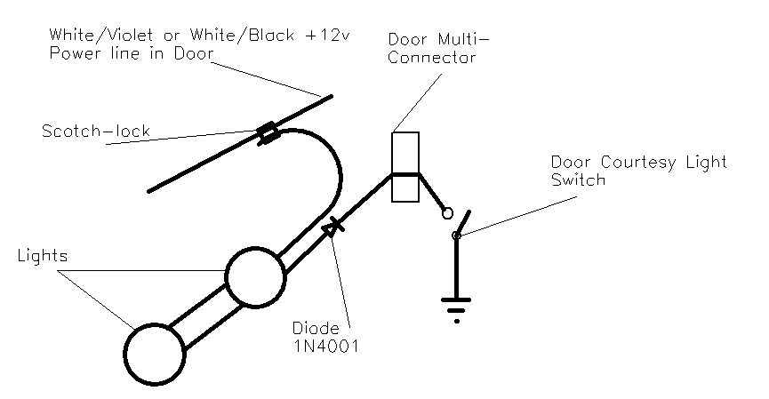 Scorpio door wiring The revised schematic for connection is fairly simple, and is shown below. A Scotchlock connector takes the +12v from the door Power cable and passes it to the light harness. The return cable from the light harness goes through the multi-connector, and terminates in the courtesy switch in the car body, just as the standard Ford design does. New Connection Schematic One complexity is that this Power cable is connected to earth when the car is locked. So the entire light system out to the courtesy switch is grounded at this time. Unfortunately, other circuits also monitor the state of the courtesy switch - if it is grounded the door must be open. So a direct connection to this Power cable makes the car think the door is open when it is locked, and the internal lights will be turned on. We can prevent this by putting a diode in the line which will stop this reverse current. Shown on the circuit is a 1N4001 diode (obtainable at Maplins, P/N 1141234). The diode must be connected into the circuit the right way around - the diagram below shows how to tell which this is.
