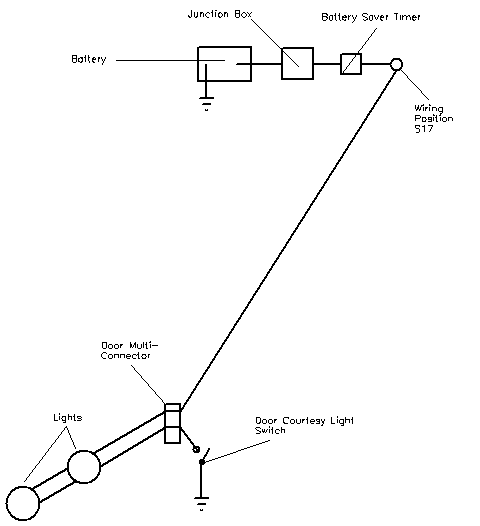 Providing power Even if there is a hole in the door base, it is unlikely that the wiring inside the door to connect the lights up will exist. So, as well as the light harness, ancillary wiring is needed. The plug which conects to the light unit socket will be useful. Also, the light cables pass through a multi-connector at the door hinge, and the pins and sockets for the door lights will not be in the connector if the car did not have the light option originally. If a multi-connector or two can be found, pin/socket pairs can be salvaged to replace the missing ones. A simple schematic of the original under-door lighting circuit is shown here. Power is taken from a central +12v point controlled by a battery-saving timer, and then passed to each door light. It then returns to ground via the door-open switch, so the lights come on when the door is open.