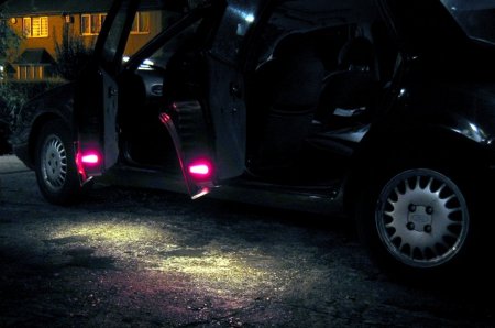 Introduction Later Scorpio Ultima owners have often aired their annoyance on discovering that under-door lighting was withdrawn in 1997, making their fully-loaded car short of an option. However, it is not impossible to retro-fit the feature to any car, and, depending on what is still left in the car, it may be quite easy. Disclaimer This item describes the way I installed under-door lighting. It does not use the standard Ford connections at all points, so results in non-standard wiring. I believe it to be safe, but I am not a qualified car electrician! Of course all wiring work in a car carries some risk of damage, and an incorrect connection can blow an expensive component, or cause a fire. You must take full responsibility for any such work you may do on your own car. Getting the hole and the lights to go in it The first thing to check is whether the car has the under-door hole for fitting the light. Cars which have the hole but no lights are fitted with a blanking plate, as shown in the illustration here.