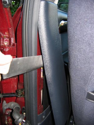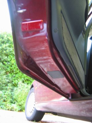Front Door Panel Rear Door Panel Behind the panel is sound proofing sponge foam. I unsealed this at the bottom of the door, using the knife to cut through the mastic and peel the foam plastic away. If the weather is hot it comes off easily. It will immediately join again if you push it back. Sound proofing separation At this point I could install the light units. There is a little steel spring clip which holds them onto the door skin. It's also a good idea to find and test the power cable which will be used - I used a dressmakers pin to connect to it. Light unit installed Testing the Power wire Step 3 - The hardest job is to connect the earth lead from the light harness through the multi-connector to the courtesy switch. Since I did not have the extra pin/socket for the multi-connector I passed the cable directly through the holes in the multi-connector where the pin/socket is missing. Cheeky, but it works, and can easily be upgraded later if necessary. The only difficulty is that you need thin wire \endash standard 5A is too thick. The actual drain when running is 1A, so 2A wire should be fine. Multi-connector Multi connector open Missing holes After undoing the multi-connector, (it turns easily), I prised off the rubber hose which carries the wires through into the door at the connector, and pulled it out where it connects into the door. Then I pushed the metal tube up through it, so I could easily thread the earth wire through. Did you wonder what it was needed for? It's easiest to begin in the middle, by pushing the wire through one of the spare multi-connector holes. Then I passed it through the metal tube in the rubber hose, and removed the tube. Finally, I connected the earth wire to my diode and plug. Releasing rear trim Rear trim internal connectors Next I went inside the car, and removed the trim behind the multi-connector base. For the rear doors multi-connector it can be prised out with the knife. The base of the multi-connector is held with a lip which can be bent up, allowing the multi-connector to be rotated and removed. I passed the cable through the hole in the side of the car, then the hole in the multi-connector base which corresponded to the hole I had used in the other half. Once done I replaced the multi-connector base.