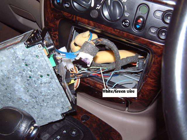 Remove the radio and locate the White/Green wire on the rear radio connector to