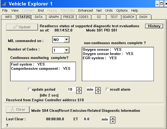 Click on the STATUS tab, and then click on Update button. Note the result on the MIL Commanded On box - should be NO - and the Number of Codes box should be 0 (zero). If Codes are 0 the Continuous monitoring complete? box should show: