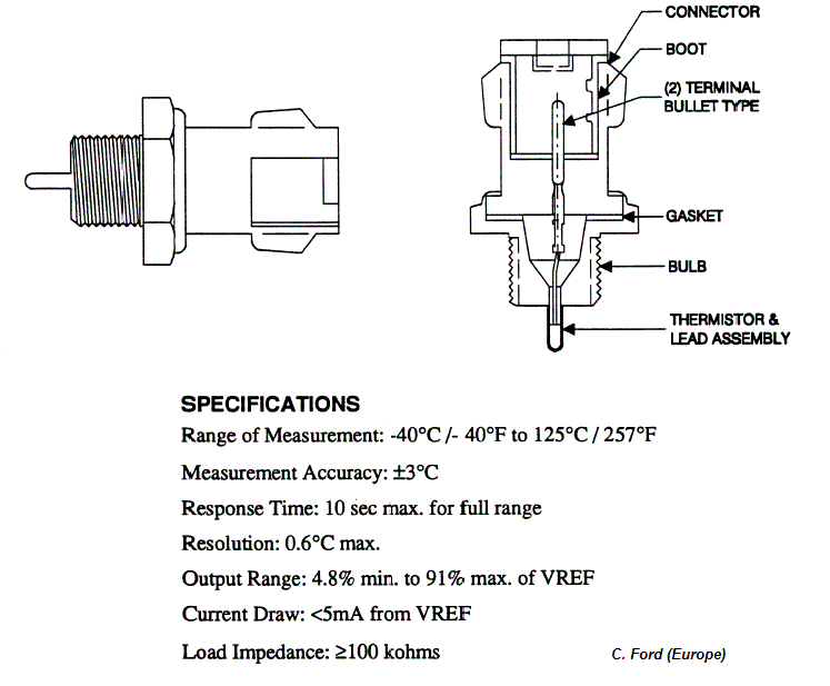 Engine Coolant Temperature (ECT)Sensor Data The ECT sensor is a temperature sensitive resistor (thermistor) connected to the internal resistor network in the Powertrain Control Module, the EECV, and it provides a output voltage inversely proportional to the engine coolant temperature. The sensor element is a 0.095" diameter disk thermister with soldered leads and a plastic protective coating. NOTE: At ambient (and only ambient) engine temperature both the IAT and the ECT resistance should show the same value. For a table of readings to temperature, see ECT data is shown below.