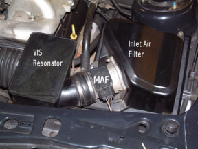 The Mass Airflow Sensor is mounted in the air inlet trunking between the air
