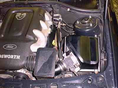 Isn't this just the dogs! The 2.9 Ford Cologne V6 has been shipped to Cosworth, where Mahle pistons and Cosworth's own cylinder heads of pentroof design, four overhead cams driven by two simplex chains and variable resonance inlet system put out 207bhp. The extra width of the new cylinder heads have meant that the ABS controller has had to be moved from the usual bulkhead site down to the n/s wing. No distributor, you’ll notice. This has been replaced by a contactless computerised system (EDIS) which is the small black item beneath the front left of the Cosworth engine shield. Why does the engine look different from the Granada Cosworth? See Ford-Cosworth 24V