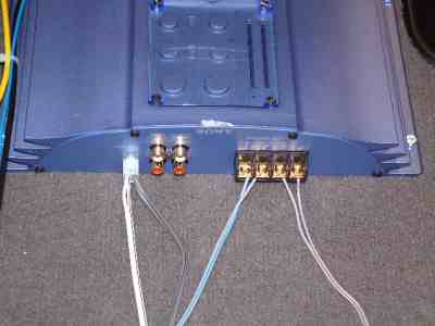 amplifier, here shown on the left. The speaker outputs are the gold plated