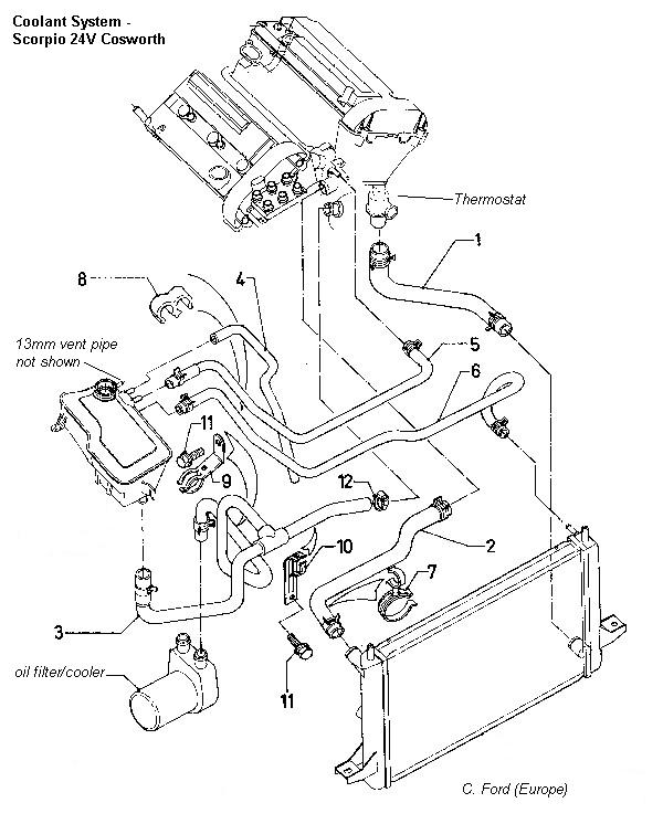 Coolant Leaks This page is a trouble shooter for the various coolant systems used on the Ford Scorpio and it is intended to help the owner locate and deal with coolant leaks. The coolant circuit on all of the Scorpio engines are closed-systems. They are not exposed to the outside air, but use an expansion tank sealed with a lift-off pressure cap to allow for expansion and contraction of the coolant. This minimises losses through evaporation, so any lowering of the coolant level inside the tank should be investigated quickly before damage occurs elsewhere. If you are constantly topping-up the coolant there must be a leak - however, finding it is not always easy. VISIBLE LEAKS When the engine is cold, jack up the front of the car onto axle stands, remove the under-engine cover (and the Cosworth engine cover on the 24V) and examine all of the pipe work closely. Common problems are: Water Pump spindle - as the water pump is spinning it needs a sealed bearing, or gland, to allow the shaft to rotate yet keep in the coolant. This shaft and the gland wears over time, and finally the coolant will escape through an expansion hole on the underside of the spindle. Quite often this coolant is thrown outwards by the pulley so that a line of coolant/rust is visible across the front of the engine bay. Cosworth owners - be aware that the water pump spindle bearing on the Cosworth should be fitted with a small pipe that carries any leakage away from the front pulley, so look for this first. EVAPORATOR DRAIN Be aware that clear water can drip down behind the engine from the evaporator drain tubes when the AC or CC is on during humid days. This is moisture extracted from the air entering the cabin through the evaporator and is often seen as a puddle after parking for a while after a run. I have been approached many times by helpful people in car parks who have pointed this out to me, thinking that this is a coolant leak - do not be alarmed, it is quite normal. This drip of clear water may also cause a hiss noise as it drops onto the very hot catalyst after run. Radiator Look for leakage along the seams and the vanes of the radiator and along the bottom. Laying underneath the car looking upward with the aid of a torch you should be able to inspect the front of the radiator behind the airconditioning condenser. Cosworth Owners - if you see the radiator 'ballooning' - that is, showing signs of swelling along the vanes particularly along the bottom, then you are another victim of this syndrome. We recommend that you take the time to change the thermostat when you replace the radiator, or this may happen again. Oil Cooler You might not be aware that on V6 engines there is an oil/coolant heat exchanger mounted on the offside of the engine block included in the oil filter housing. Since coolant always flows through the heater matrix on the Scorpio, (it is the heater doors that close off the heat) this exchanger brings the oil up to temperature quickly, then stabilises the oil temperature so that even on the hottest days the oil stays at about the same temperature as the coolant. Two hoses lead from this housing, one from the heater matrix and the other from the the main bottom radiator hose. The figure below illustrates this - the heat exchanger is the item on the left end of the hose T-piece on (3). One owner reported that this hose had deteriorated and needed to be replaced. Hoses (5) and (6) allow any air bubbles to escape from the circuit into the air space in the expansion tank and if these are blocked (normally at the expansion tank flanges) then the system will be difficult to fill.
