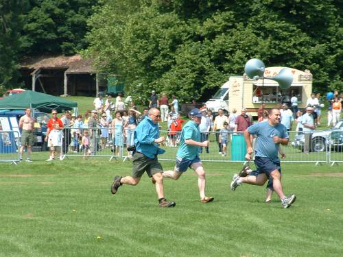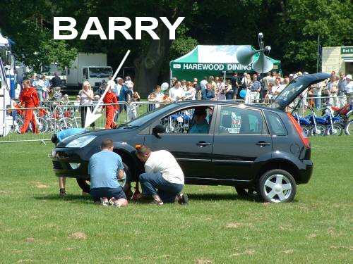 The cars proved a great attraction, particularly with the bonnets open showing the always impressive Cosworth name. One visitor remarked that he was amazed how popular these cars now were because he had been a Ford salesman, trying (without too much success,) to move them when they were new! We were persuaded to enter a team in the pit stop challenge. All we had to do was change the wheels on a Fiesta "and it's already jacked up" they said. What they didn't tell us was that it was at the far end of an arena, in front of the 3000 people, and we had to run up to it and back again in the blazing heat.