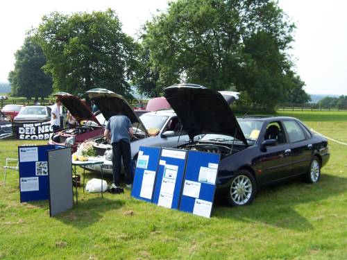 I had prepared a display board with three sections to show visitors the forum, the mailing list and the website itself. together with photographs of the work on my car. To stop the board falling over it lent up against my bumper. An ideal way to hide all the stone chips which I haven't yet tackled. Andrew had provided a standard Scorpio details sheet that we all filled in and placed in our windscreens. Barry brought a four-meter banner from the German Scorpio launch, which set the scene nicely.