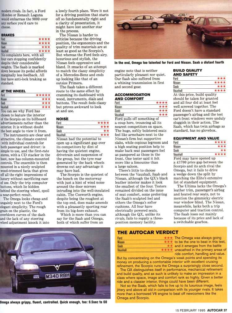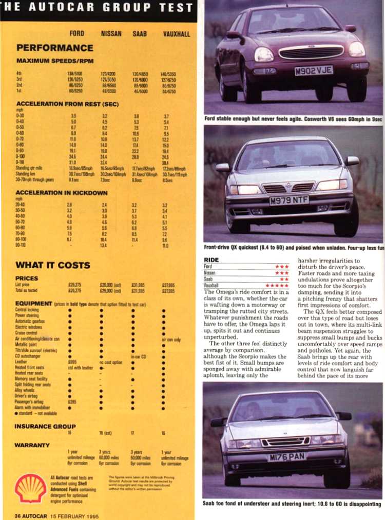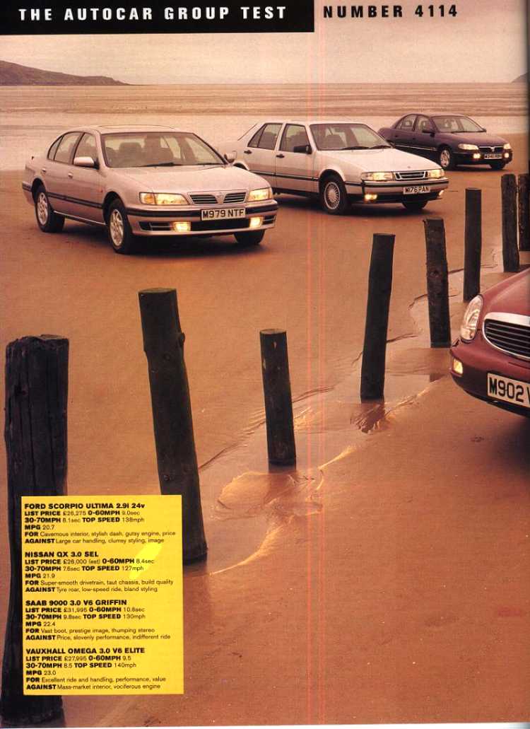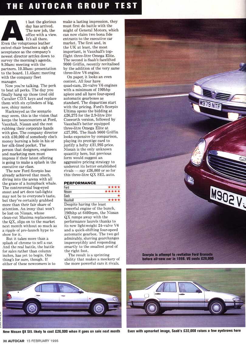 Feb 1995 Autocar New Scorpio V Saab 9000 V Vauxhall Omega V Nissan QX