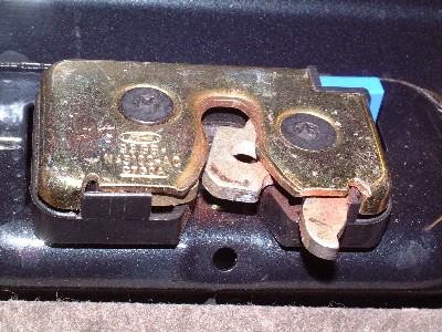 Close up of the latch plate mounted on the bottom of the door. The forward lever is ready to pass the pin, and the part of the lock to the left receives the latch pin and forces the whole plate to swivel, so that the long part passes across the face of the pin and locks it tight. It is this movement that cuts through the plastic, especially if the tailgate is slammed shut on some obstacle.