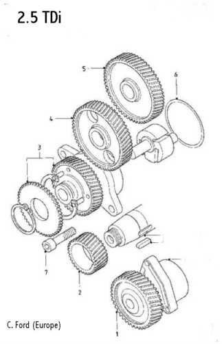 in turn engages the camshaft gear (4) which then drives the injection pump (5).